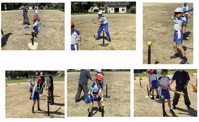 「バッティングティー」と呼ばれる棒の上に置かれたボールを、野球と同じようにバットを振って飛ばします。