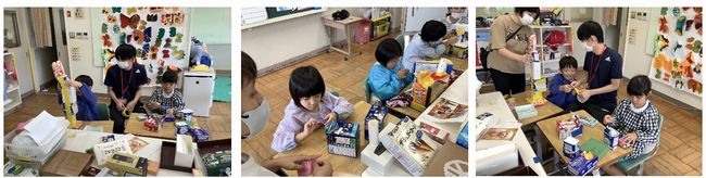 自分の思い浮かべたイメージに沿って箱をつなげたり、自由に箱をつなげていくと次第に何かの形になったりと、空き箱が動物やキャラクターに変身しました。